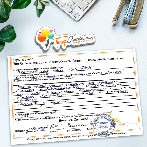 Это не первый курс, по которому мы проходим обучение в "Профакадемии". Материалы курса актуальны, ими можно воспользоваться и после обучения. Программа составлена доходчиво, понятно. Спасибо за обучение.