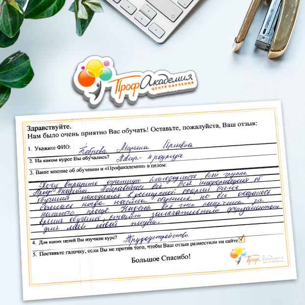 Я в восторге, давно не училась, было страшно начинать, но когда начала обучение, понравилось, все доступно, текст понятен, очень хотелось после чтения задания сразу пройти тест. Персонал академии выслал все документы на почту. Спасибо всем с кем я общалась во время обучения. Дальнейших успехов в работе.